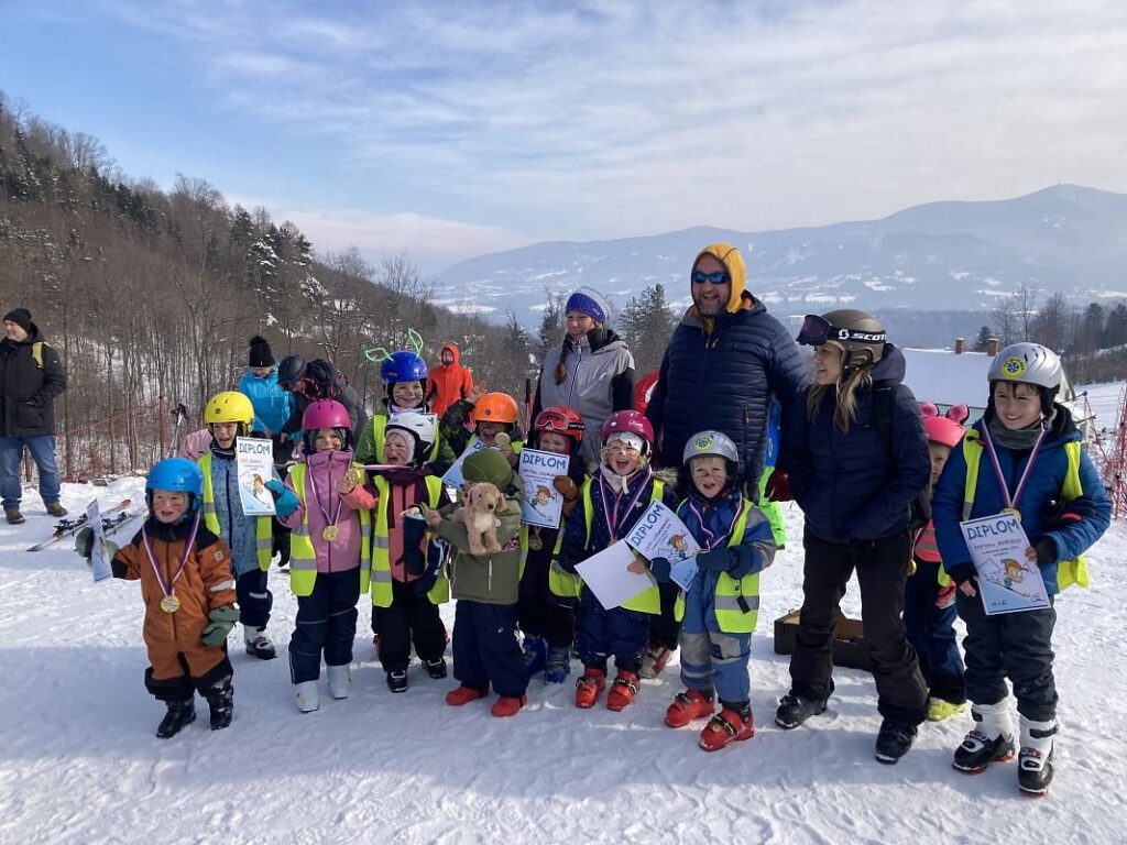 Únor pak přinesl další výzvu. Na jeden týden jsme vyměnili čepice za přilby, sněhule za lyžáky, okolí školky za zasněžený svah s lyžařským vlekem a průvodkyně za zkušené instruktory lyžování. Většina dětí absolvovala lyžáček na Opálené. Celý týden zapáleně trénovali a v pátek předvedli své nově nabyté dovednosti v závodě, ve kterém všichni získali sladkou medaili.