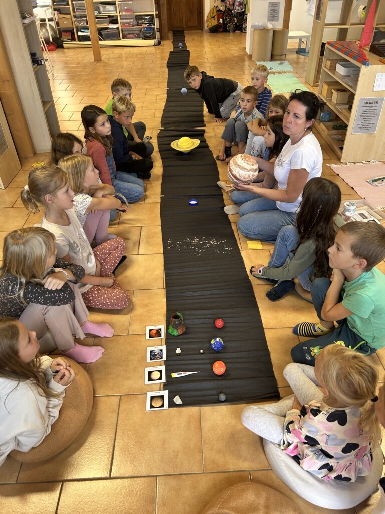 - Ve druhém a třetím trojročí přibývá pravidelných ukázek z matematiky, češtiny, kosmické výchovy a dalších oblastí. Některé části výuky jsou propojené s rozvrhem externích lektorů (např. angličtina, IT, biologie, historie). Děti se zároveň více zapojují do projektů a společné práce.
